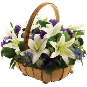 Country living A elegant floral gesture that says it all Basket arrangement in white Lillie’and purple flowers.
