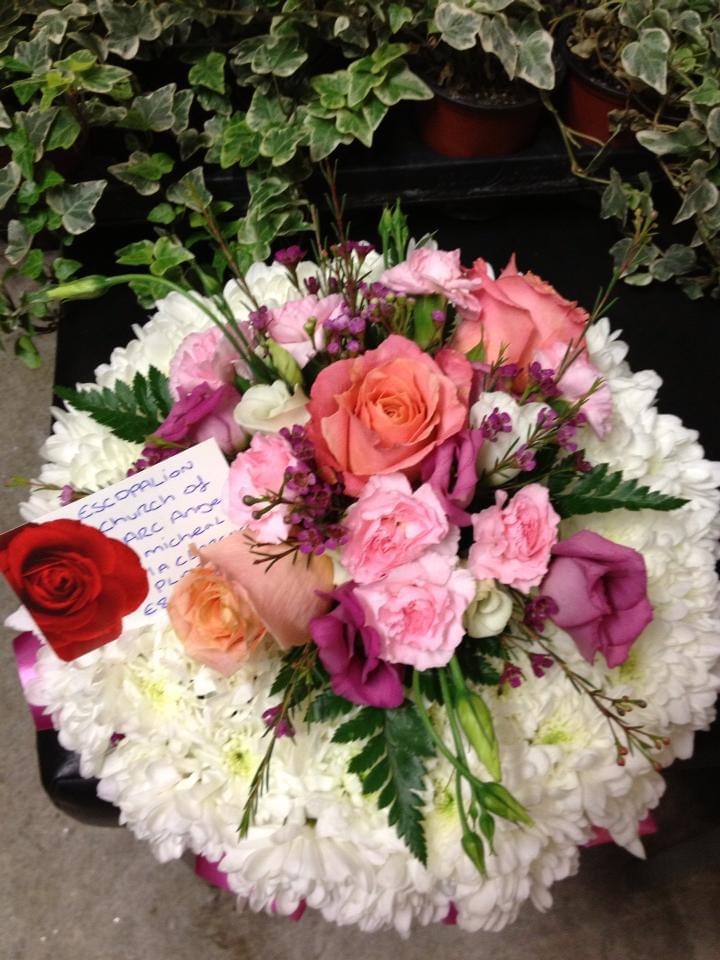 FF15 baby girl posy Posy pad ribbon edge double whites chrysanthemum finish with a spray in shades of pinks.