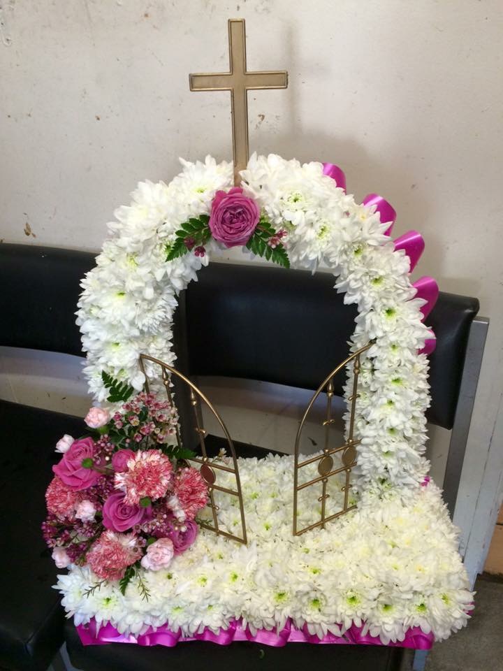 classic Gates of heaven shaped design based with a mass of Double Spray Chysanthemums the perfect base for the spray of large-headed Roses and scented Freesia that are complimented with dainty flowers and foliage. The tribute can be skilfully created by Yazs flower gallery in colour tones of lilac and white, red and white, or yellow and white. Pink,Or any colour you desire.