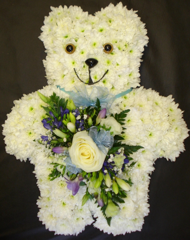 Teddy shaped design based with a mass of Double Spray Chysanthemums the perfect base for the spray of large-headed Roses and scented Flowers that are complimented with dainty flowers and foliage. The tribute can be skilfully created by Yazs flower gallery in colour tones of lilac and white, red and white, or yellow and white. Pink,Or any colour you desire.