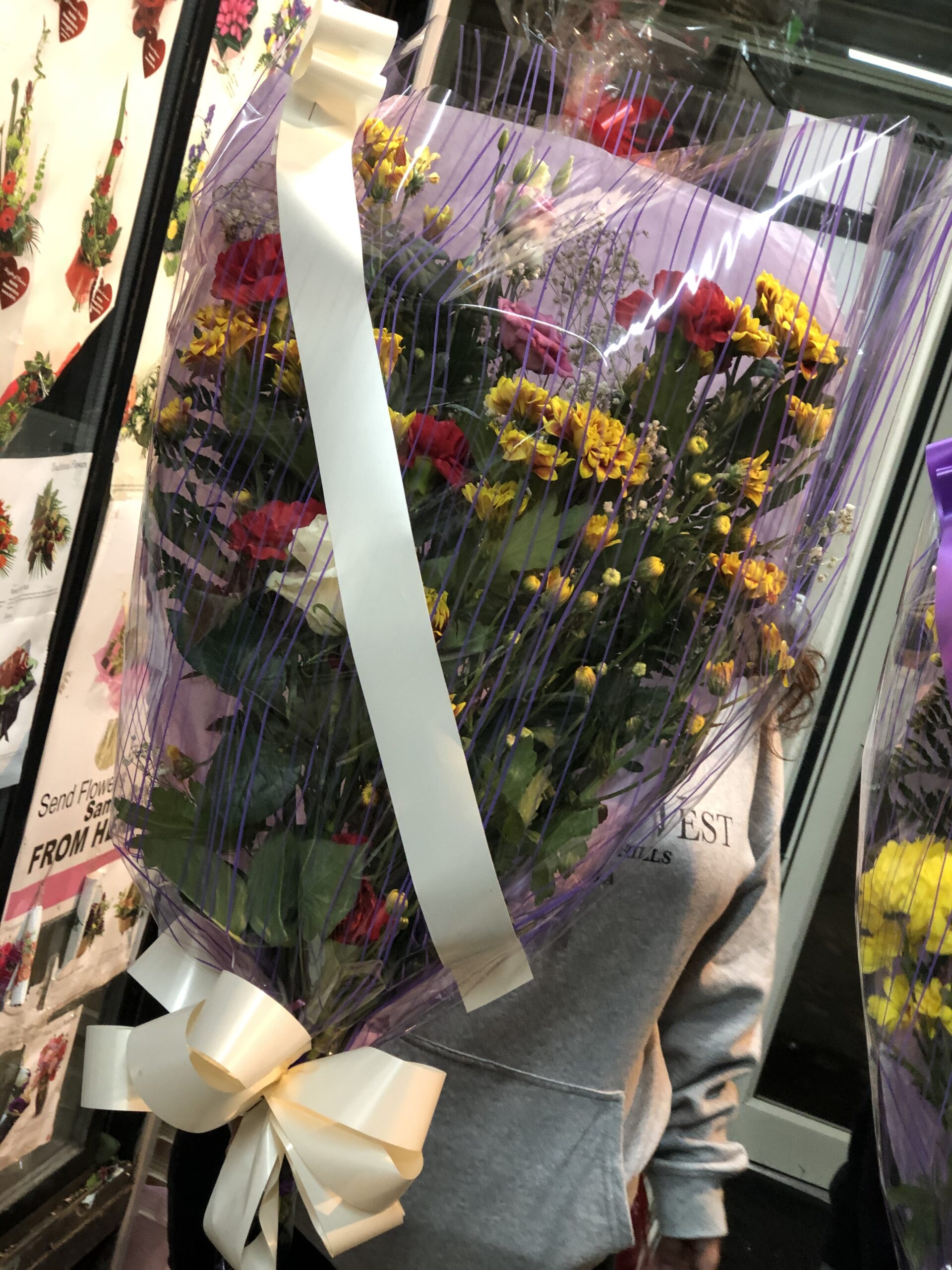 Ff33 funeral flowers in cellophane Mixed Flowers wrapped in cellophane suitable for a funeral in white bow.
