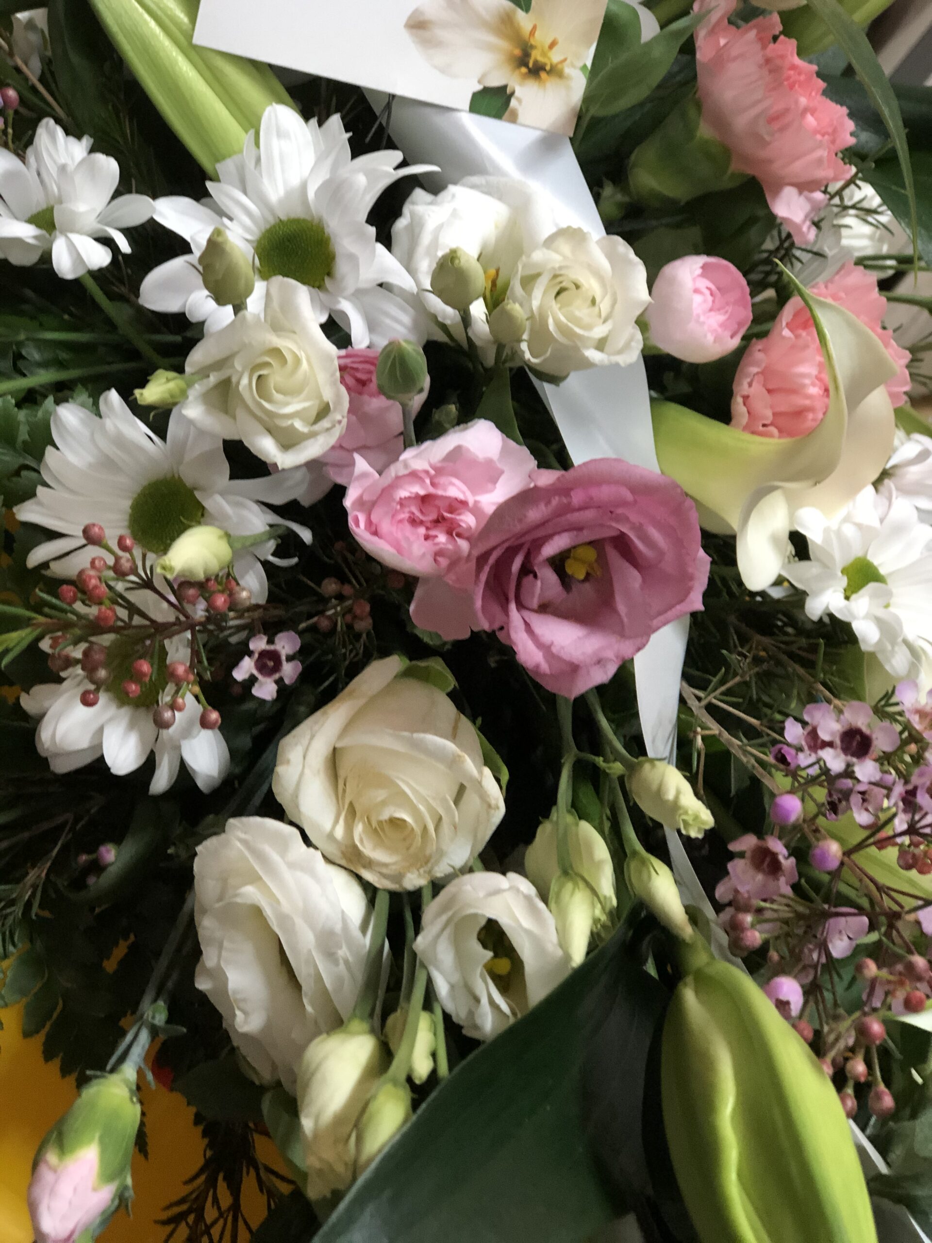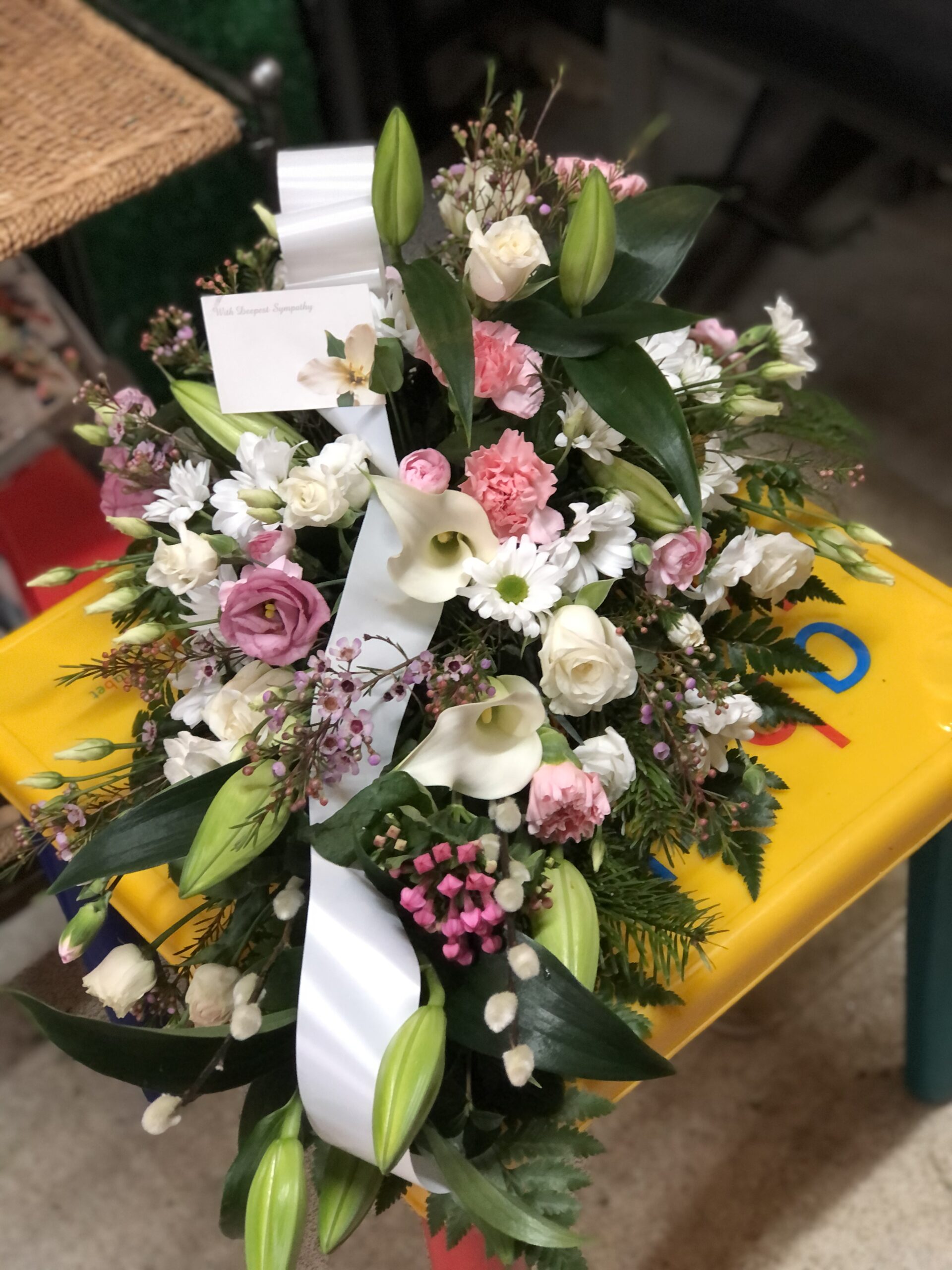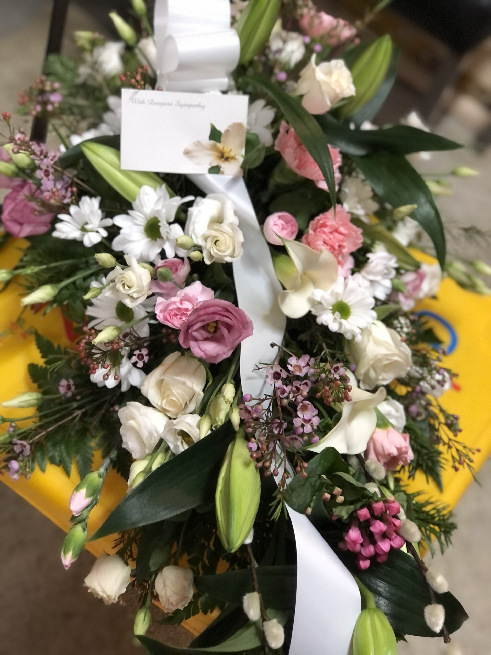 Ff44 Single ended spray Single-ended spray in Oasis with a luxury mix of pinks and white flowers.