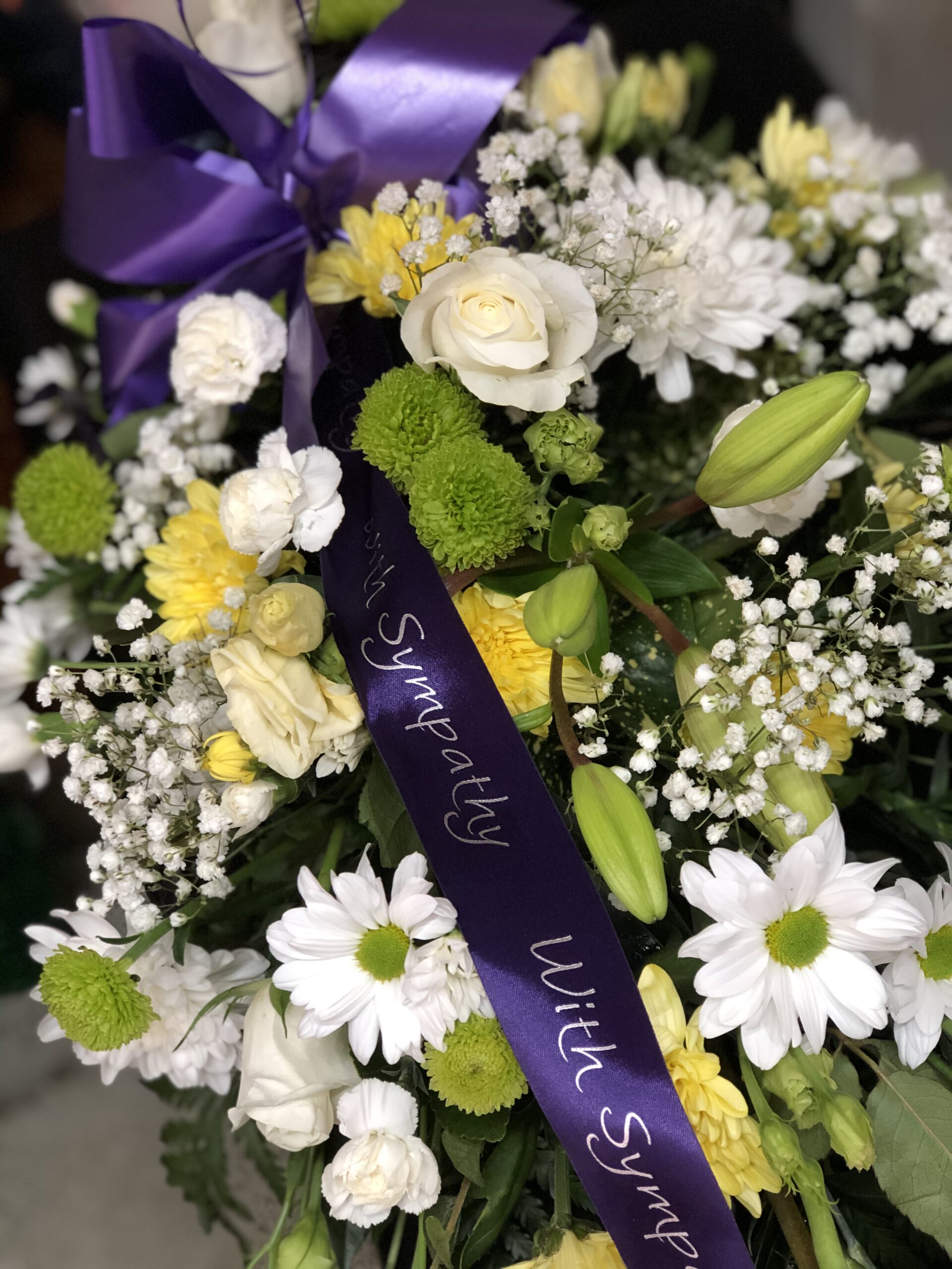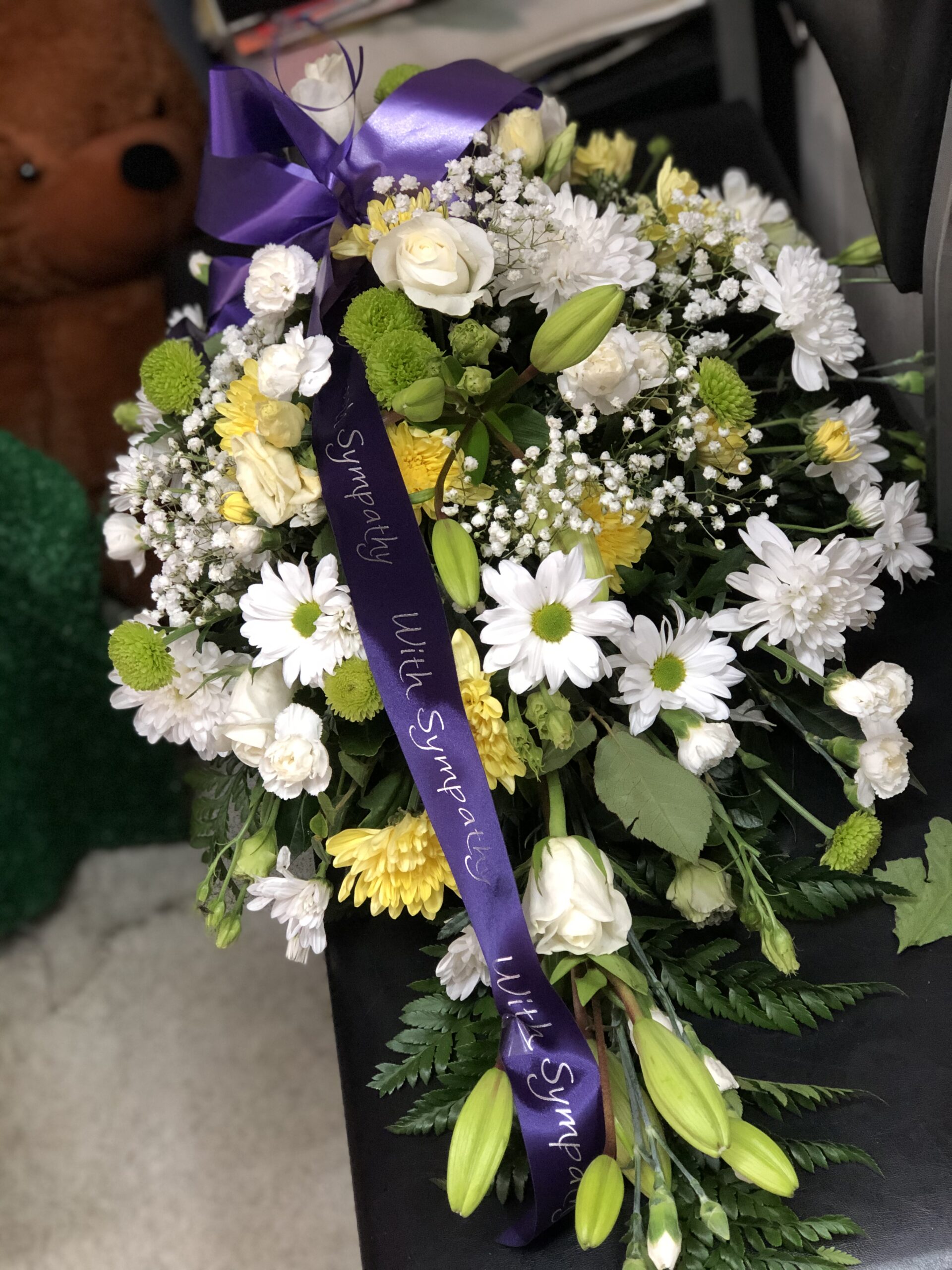 Ff45 purple single- ended spray A gorgeous white and purple single ended Spray white lilies with a mixture of purple flowers with luxurious foliage to complete the design beautifully.