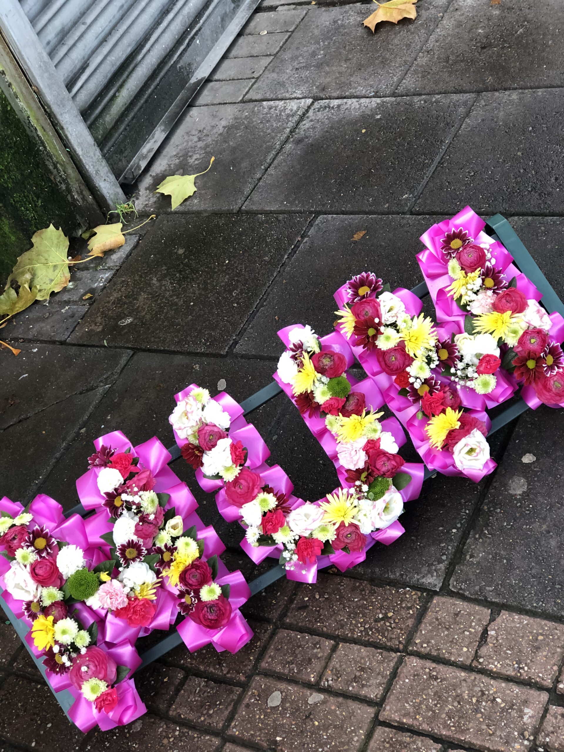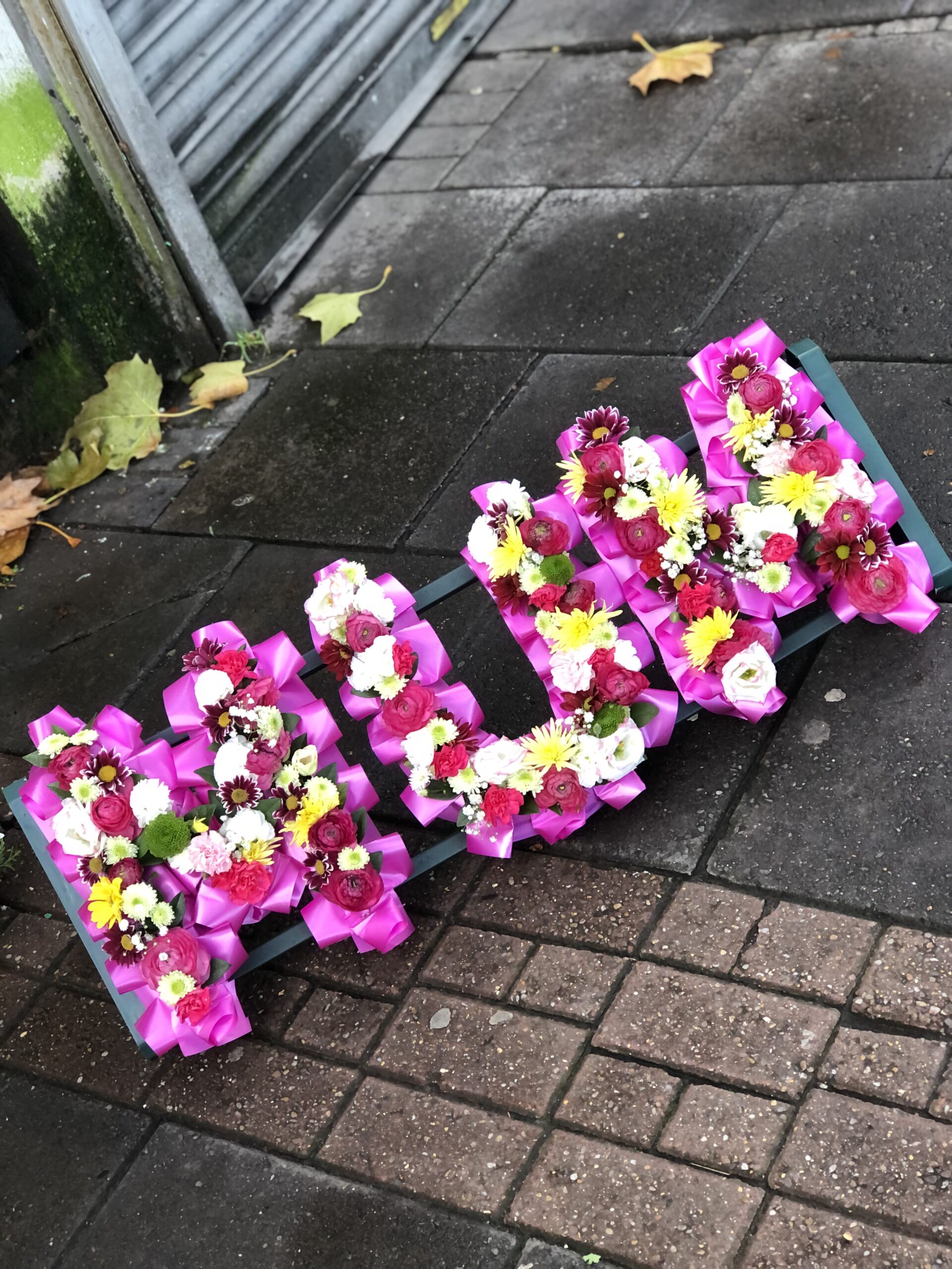 Mixed colourful letters we custom make the letters any letters you like.that have come together to create a superb Dad floral letters tribute. The tribute comes in two parts and is a very popular funeral flower product. If these flowers are for a funeral, please make sure to inform us in the instructions box of the name of the deceased, as well as the name of the funeral director. If possible, always arrange for these flowers to arrive a day before the funeral.