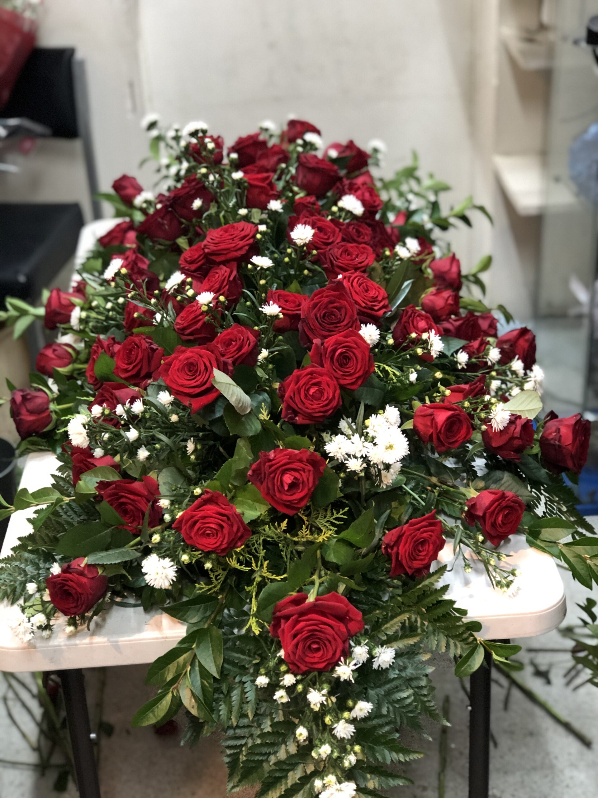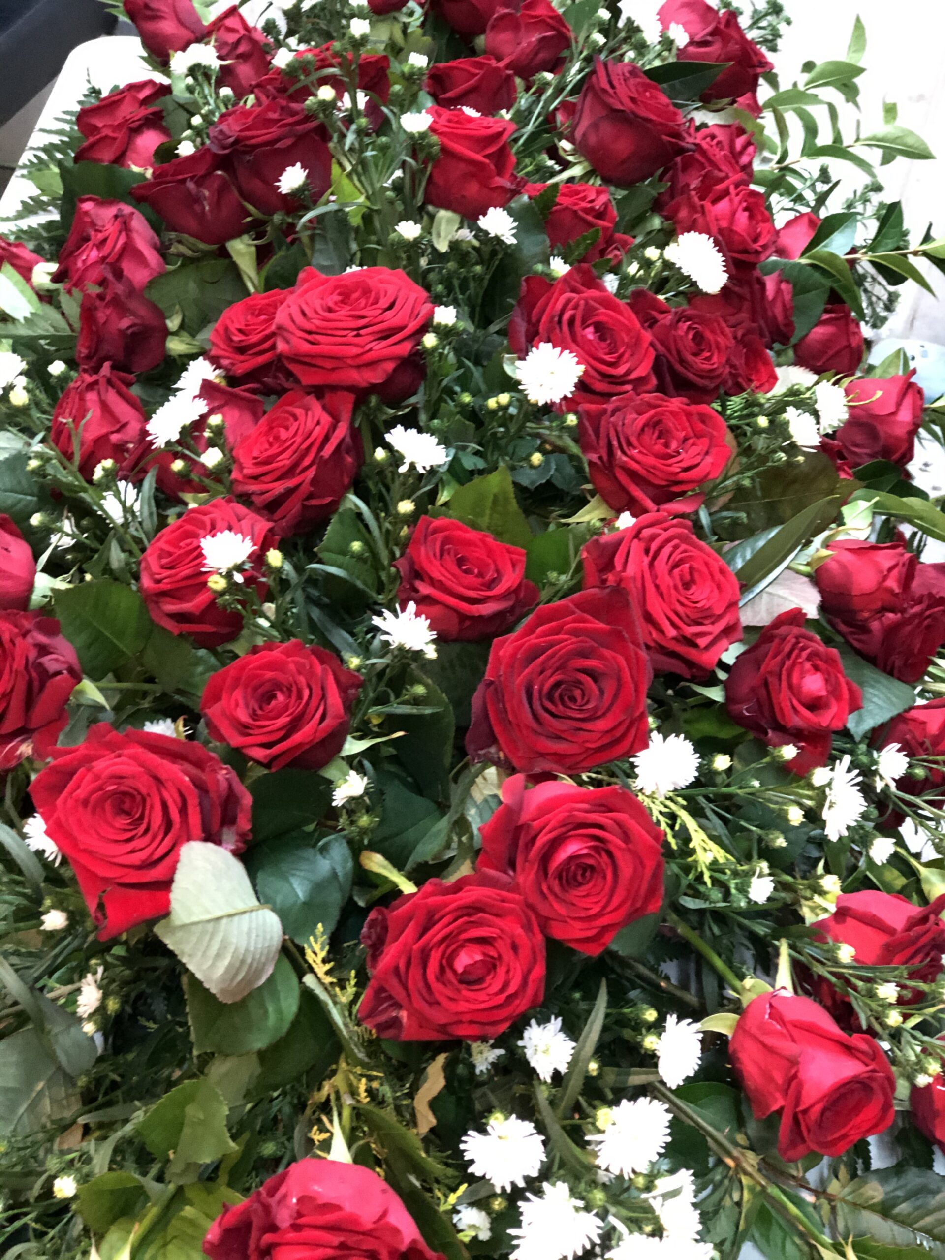 A beautiful display of velvety red roses, complementing foliage and hypericum berries. Choose from red roses, as pictured or pink, white or yellow. Standard price is for a 4ft (122cm) tribute.