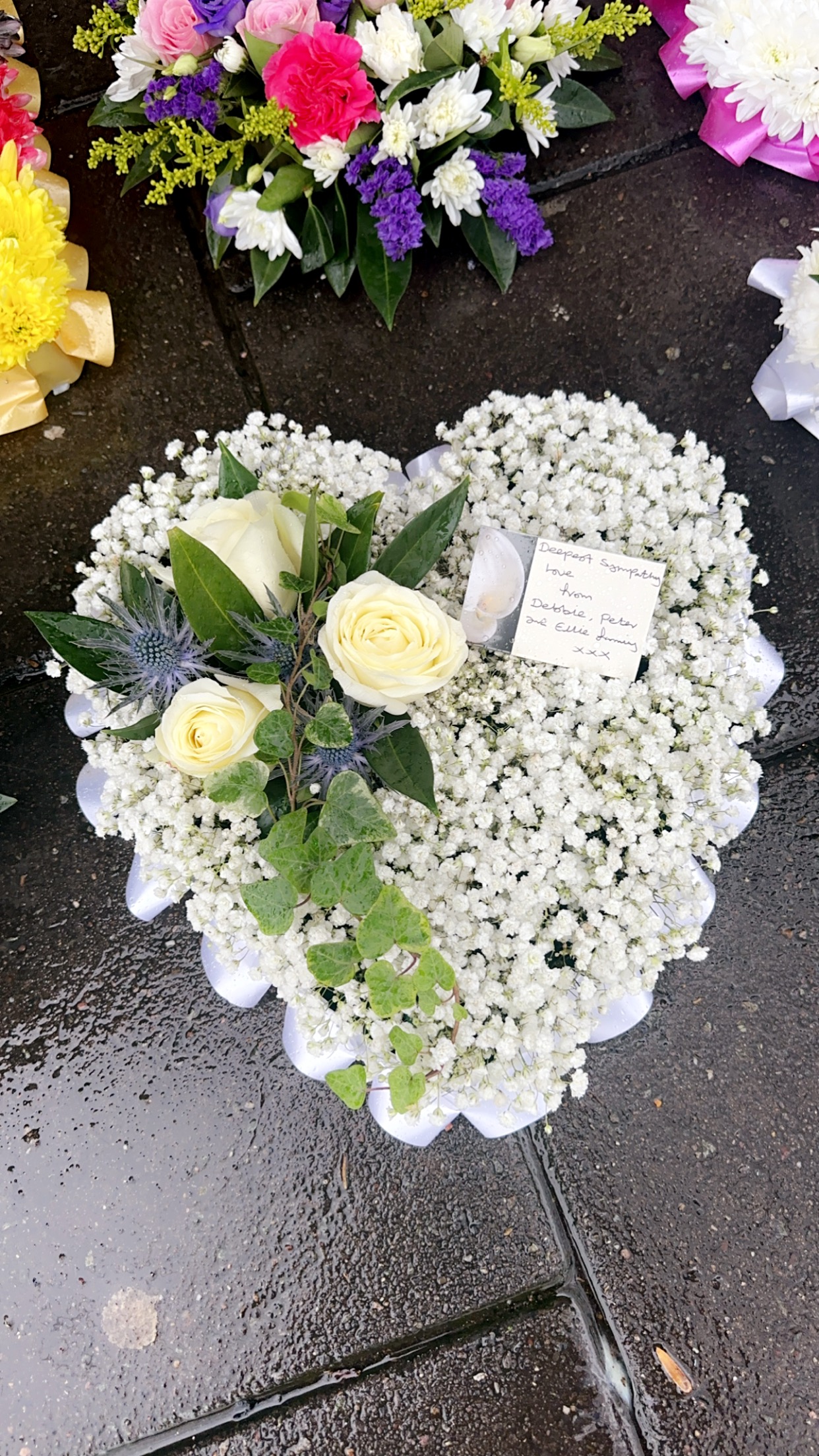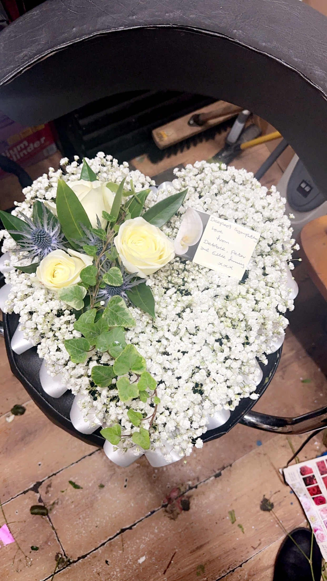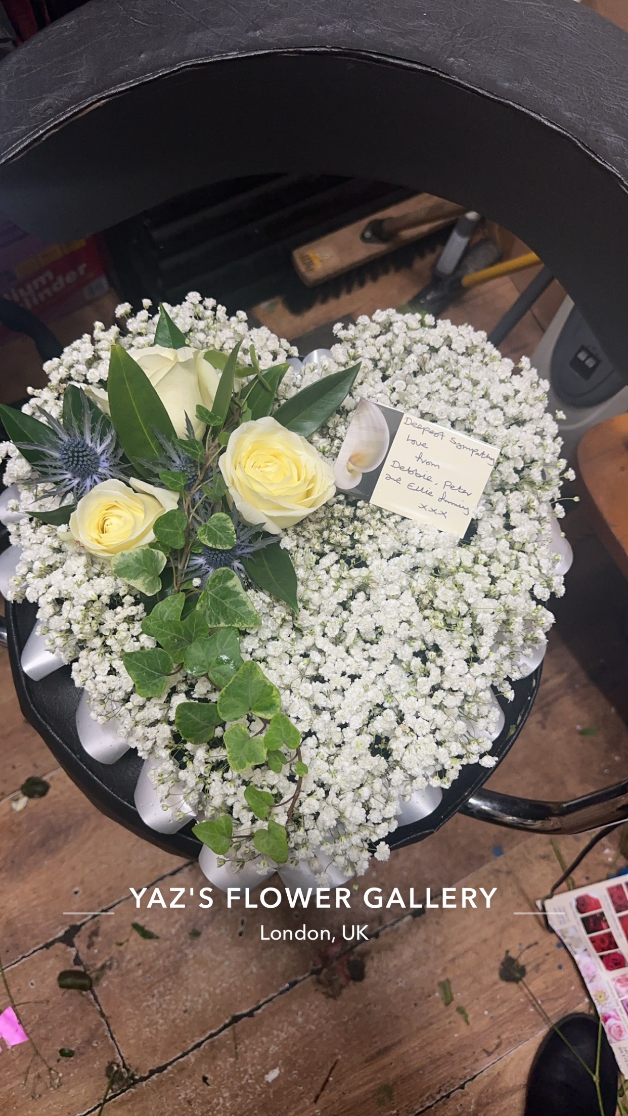 Ff63 Heart Adornment A heart tribute of green and white featuring delicate, gypsophila, and ivory roses.
