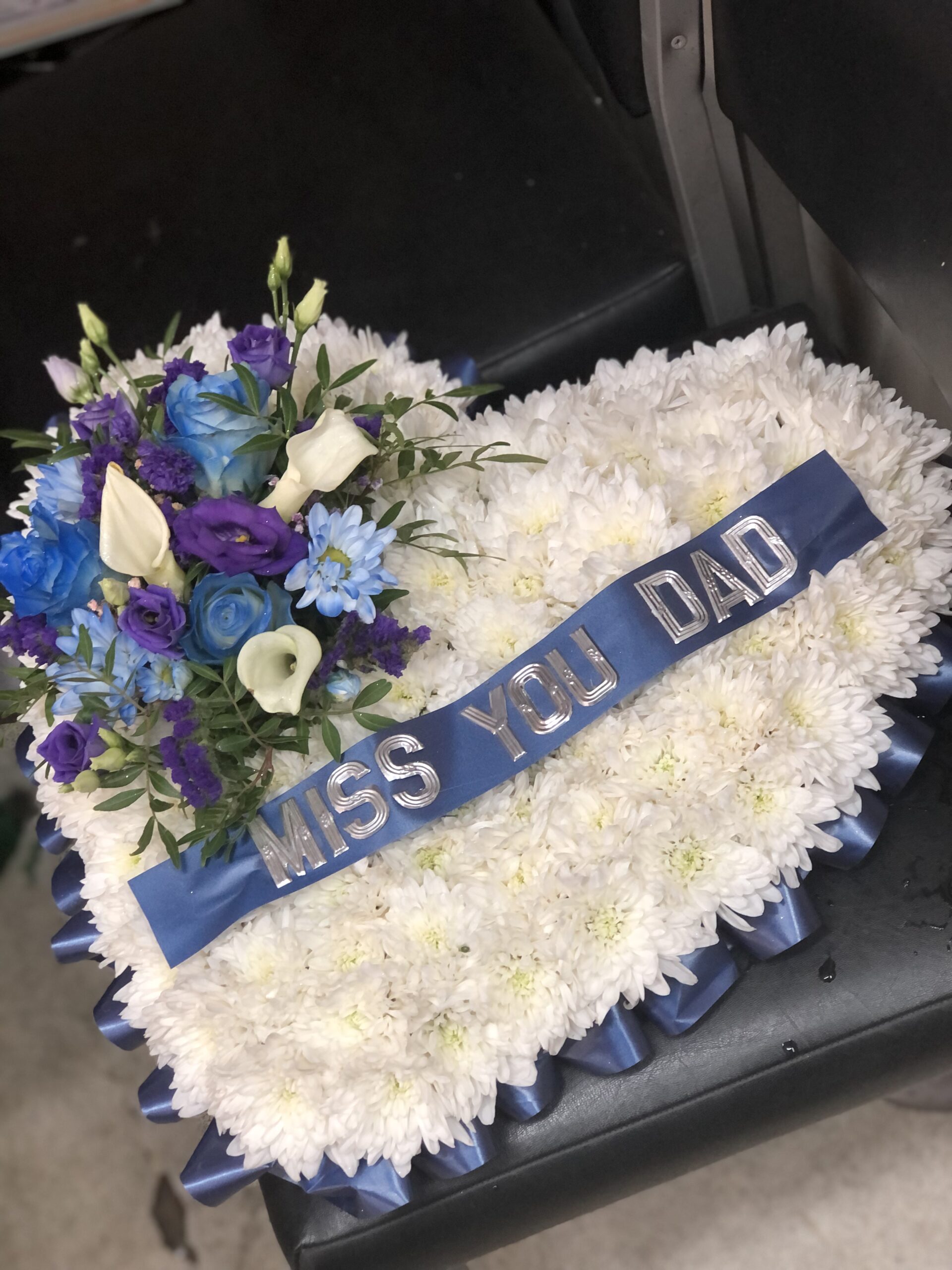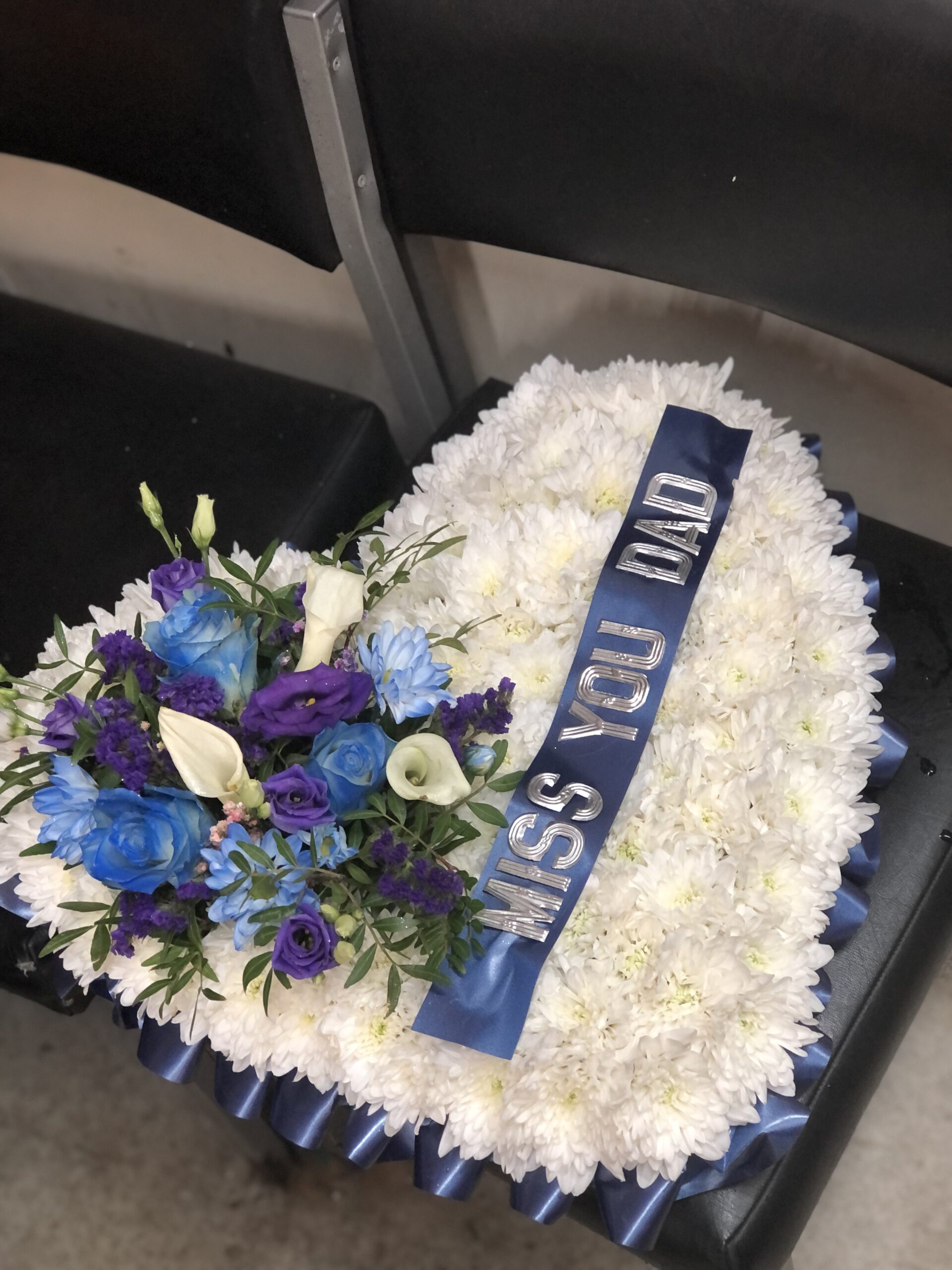 FF65 heavenly dad heart A gorgeous white and blue heart white doubles mixture of flowers with luxurious foliage to complete the design beautifully.