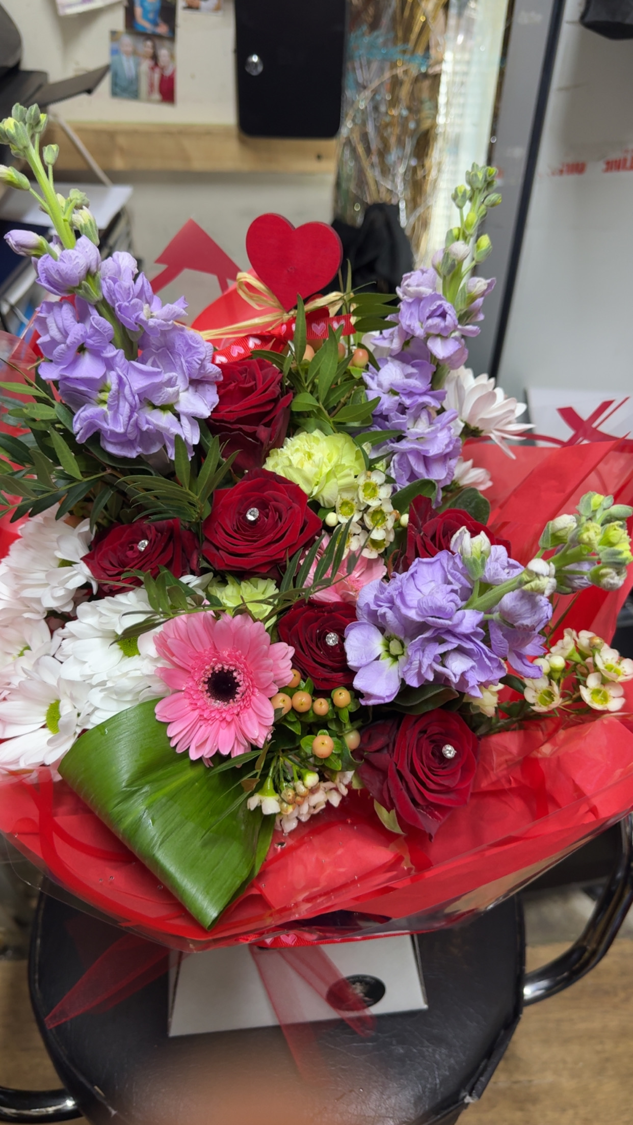 A beautiful magical bouquet with pink shades and whites with roses perfect for a loved ones Comes in a Aqu box and wrapped with a bow to