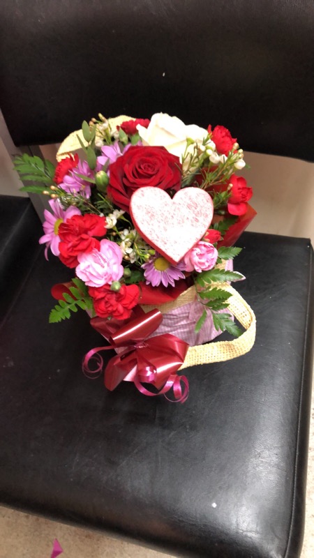 In red and pink with a Single red rose in the middle. Arranged in a gift bag.