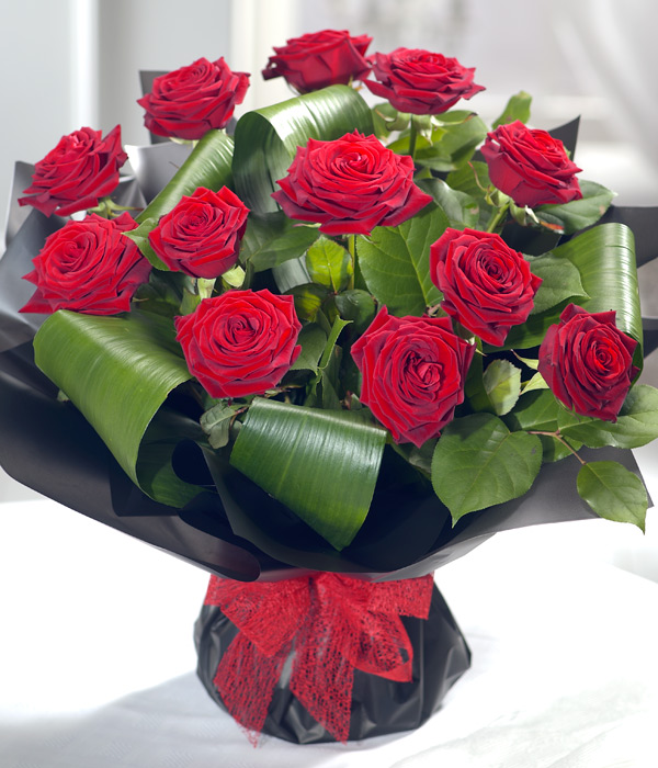 Red love 12 long stemmed red roses filled in greens and wrapped in luxury wrapping and presented in aqua