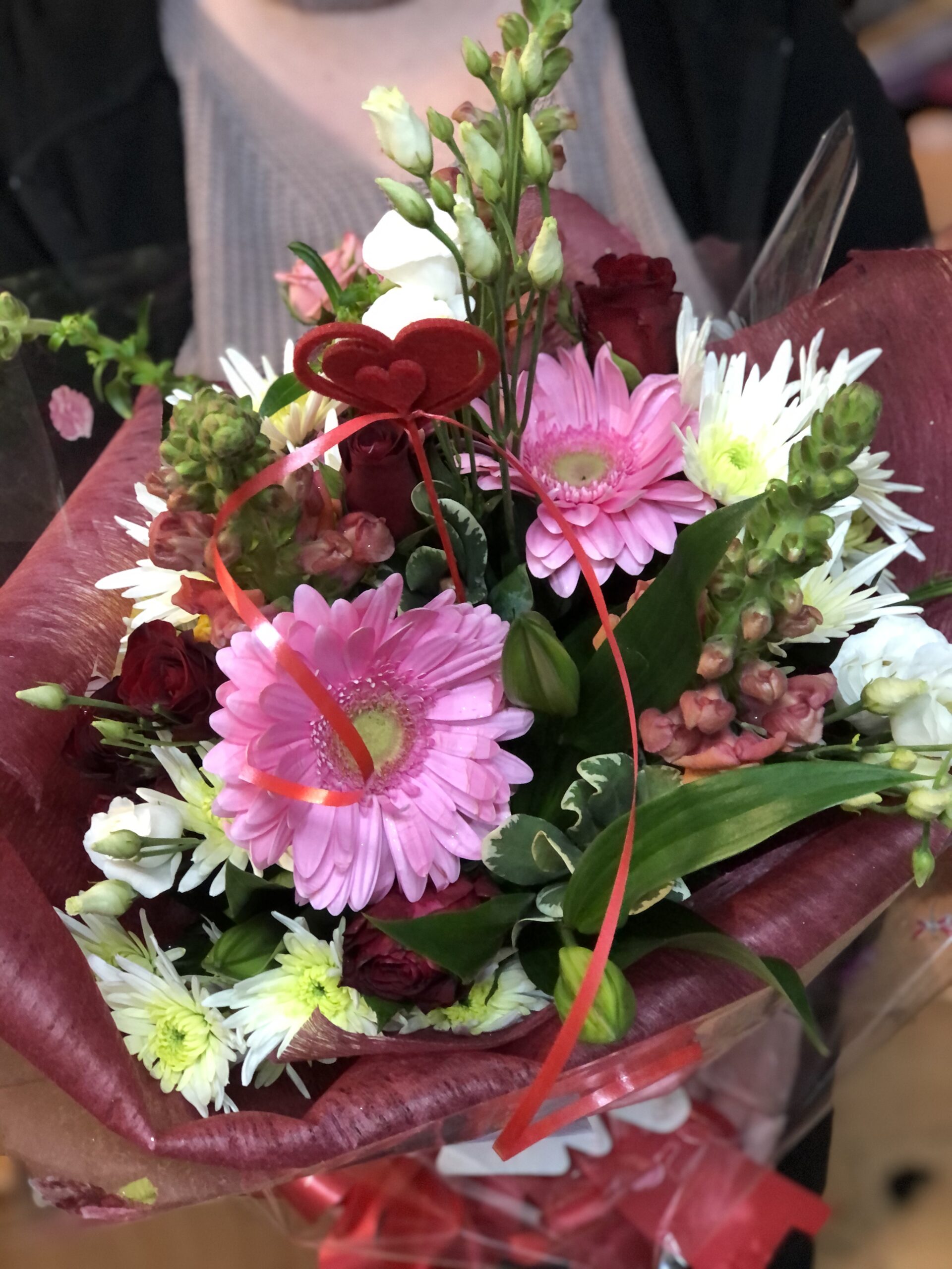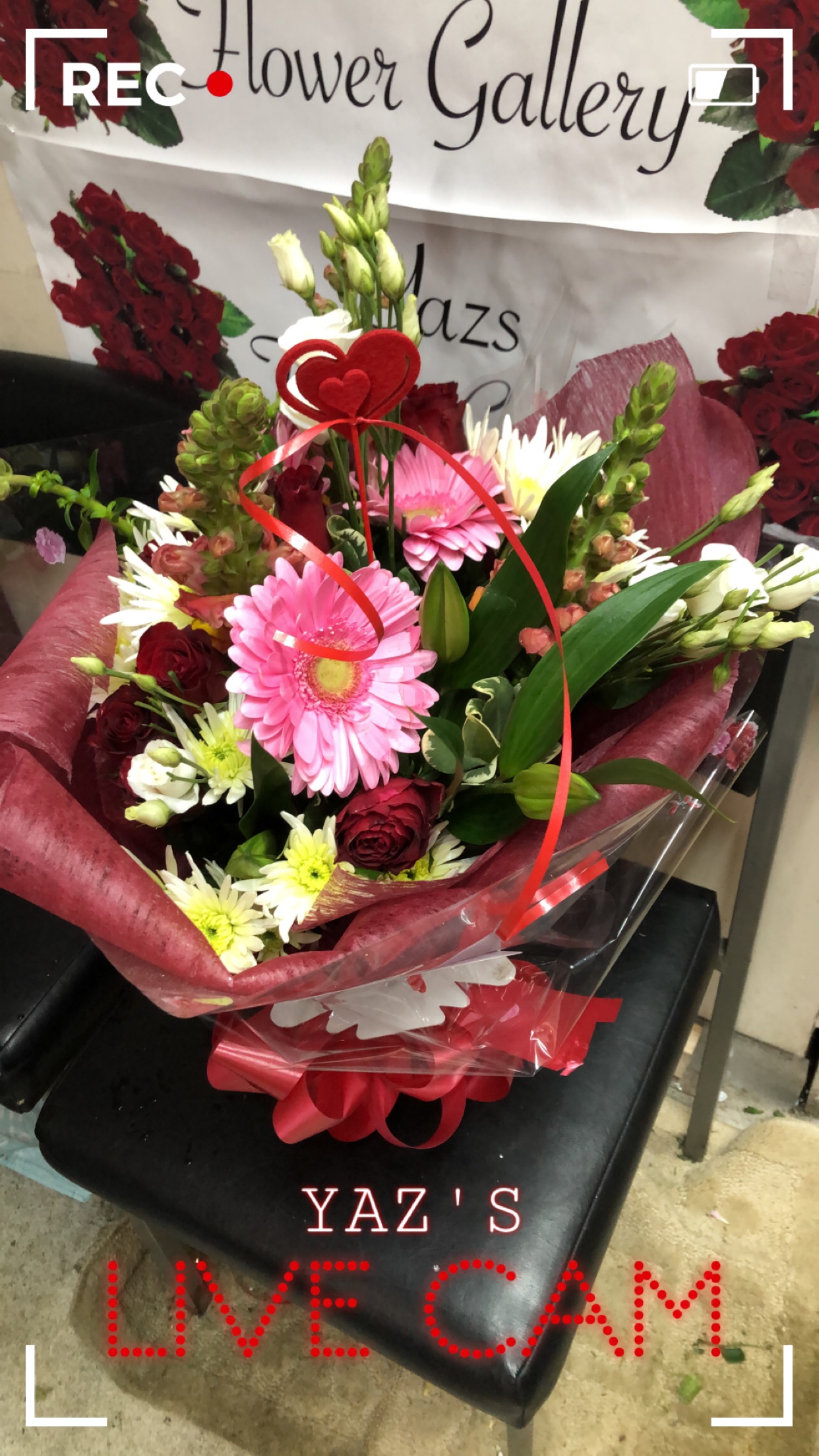 In pink Gerber’s red roses ?and a mix of blooms finish off with lush greens.  ideal for any occasion gift wrapped ?