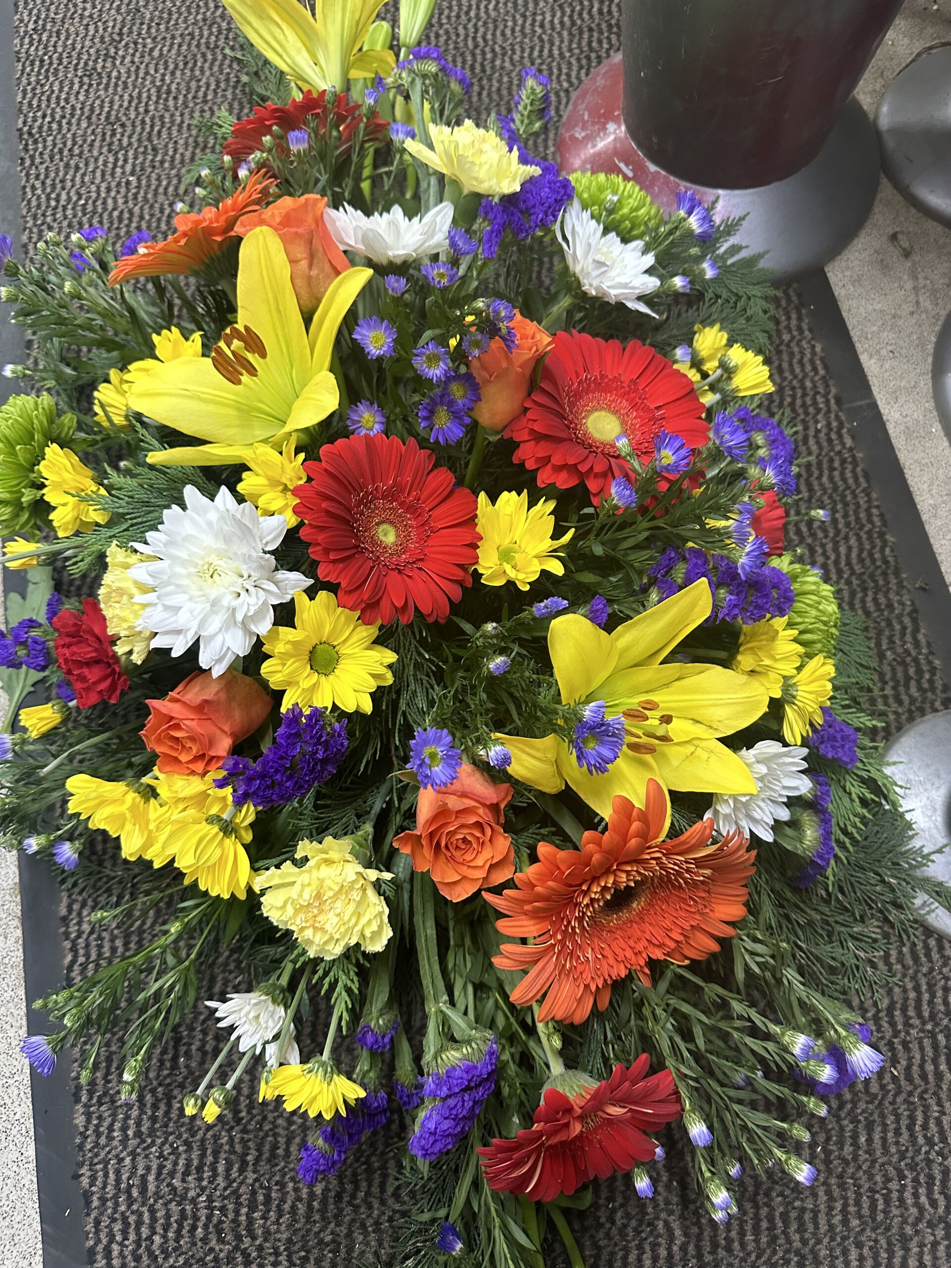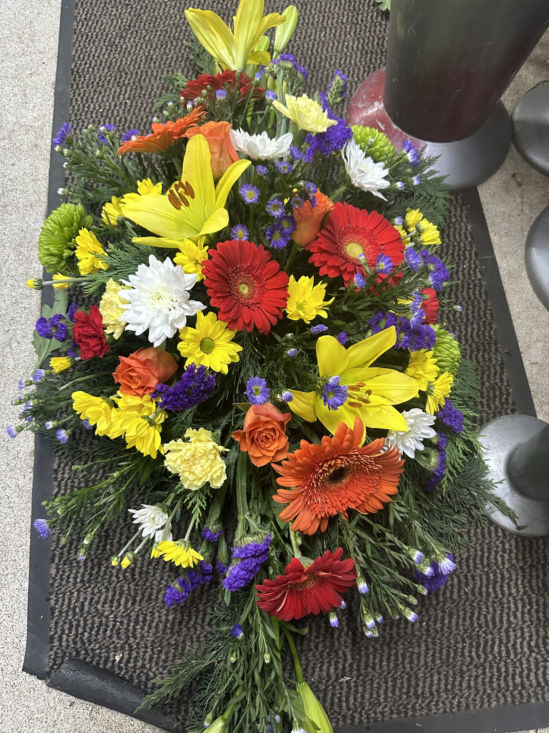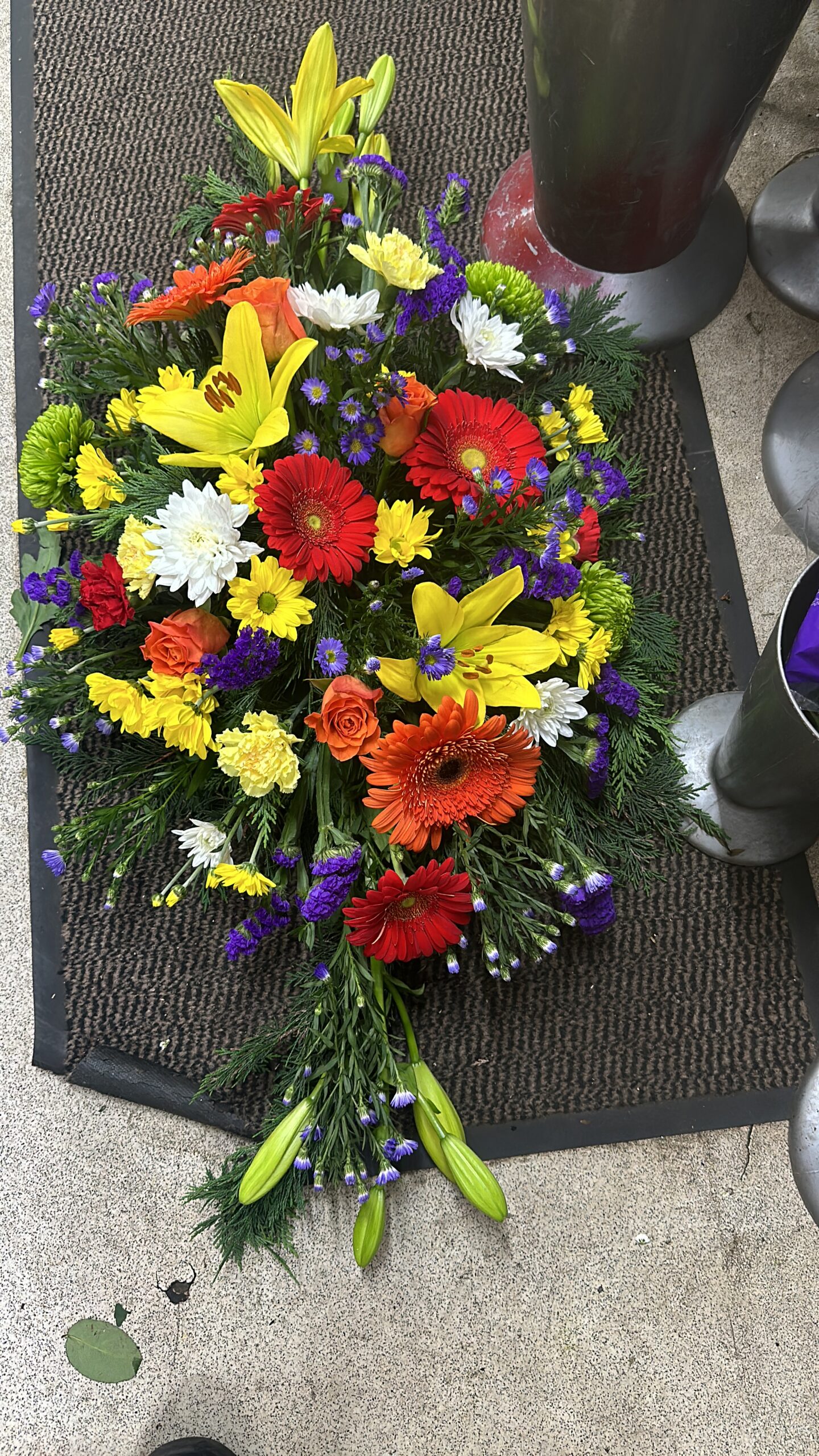 single- ended spray A gorgeous single ended Spray yellow lilies with a mixture of flowers with luxurious foliage to complete the design beautifully. Image is for the large option