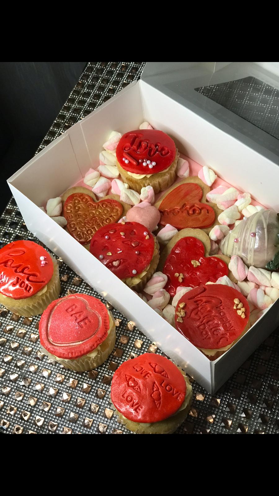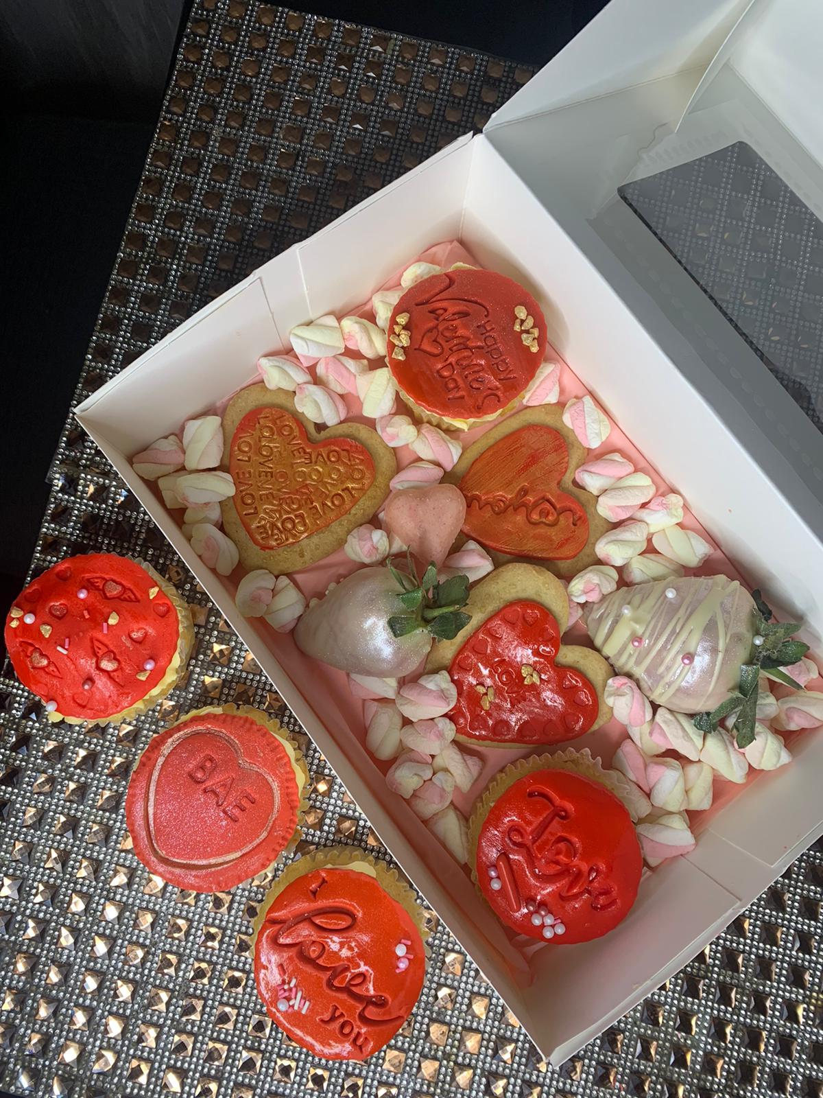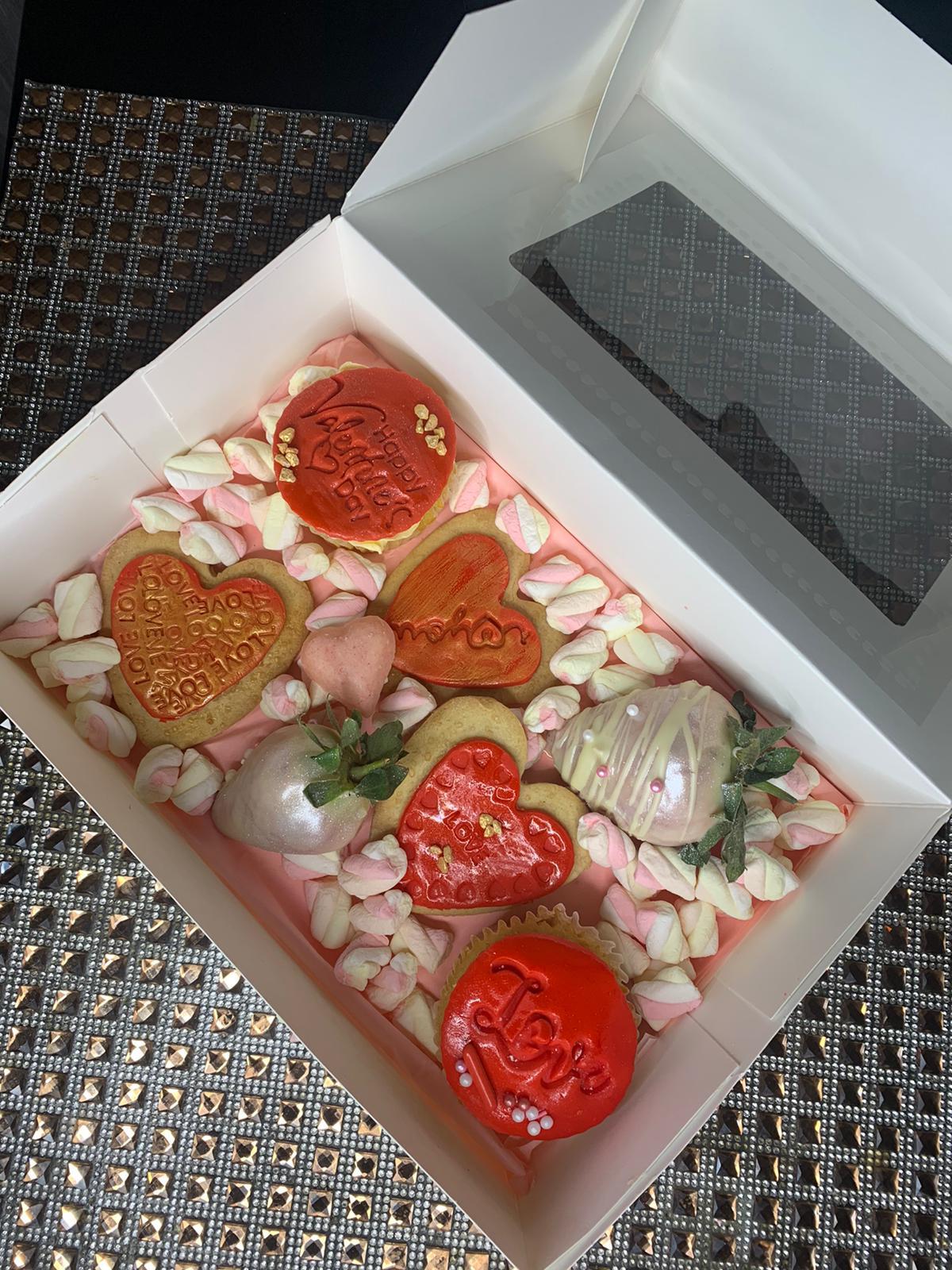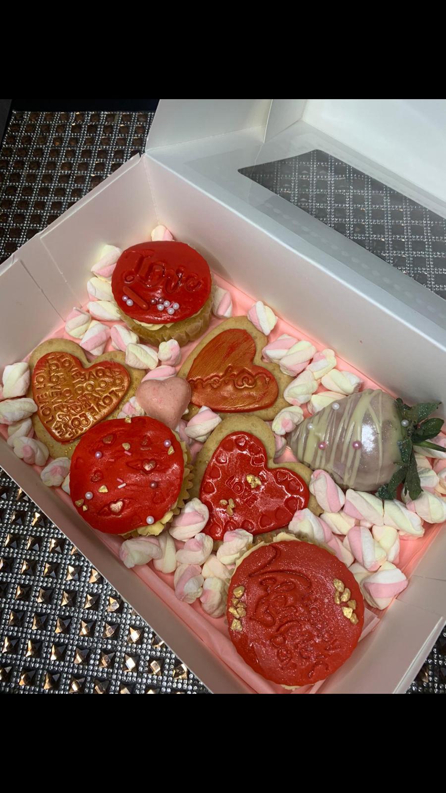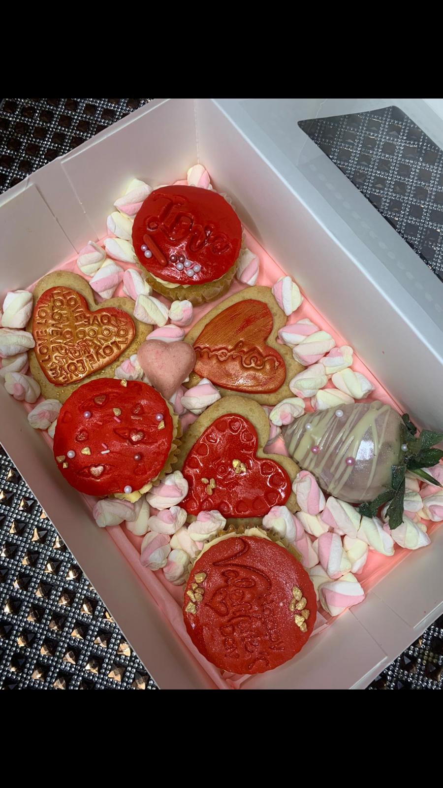 Comes with cupcakes, biscuits, chocolate covered strawberries and  yummy  marshmallows.